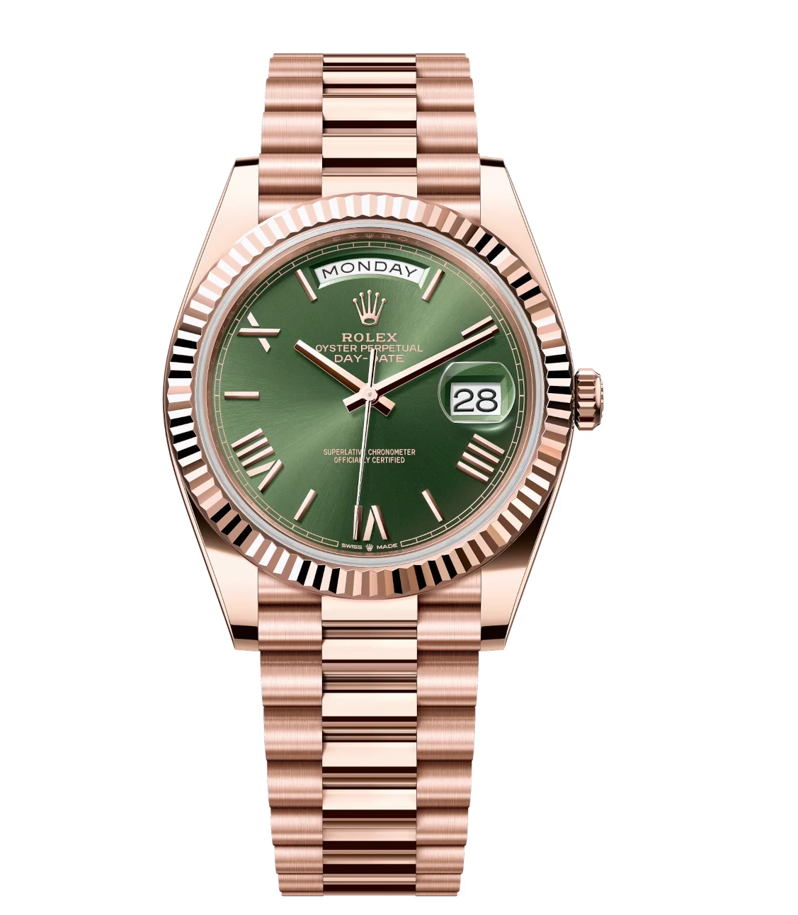 Rolex Day-Date 40 Oyster Perpetual 18 ct Everose gold olive-green dial fluted bezel President band Reference 228235