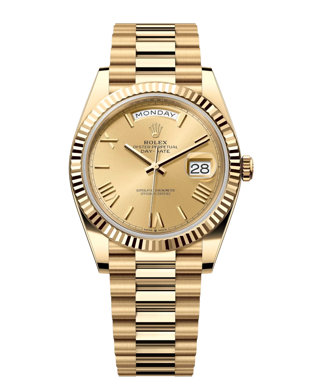 Rolex Day-Date 40 Oyster Perpetual 18 ct yellow gold champagne-colour dial fluted bezel President band Reference 228238