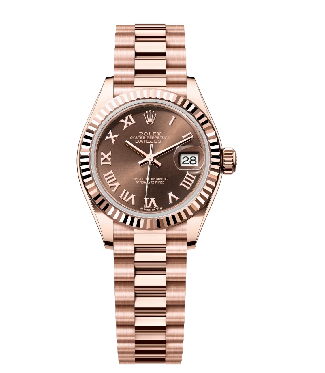 Rolex Lady-Datejust 28 Oyster Perpetual 18 ct Everose gold chocolate dial President band Reference 279175