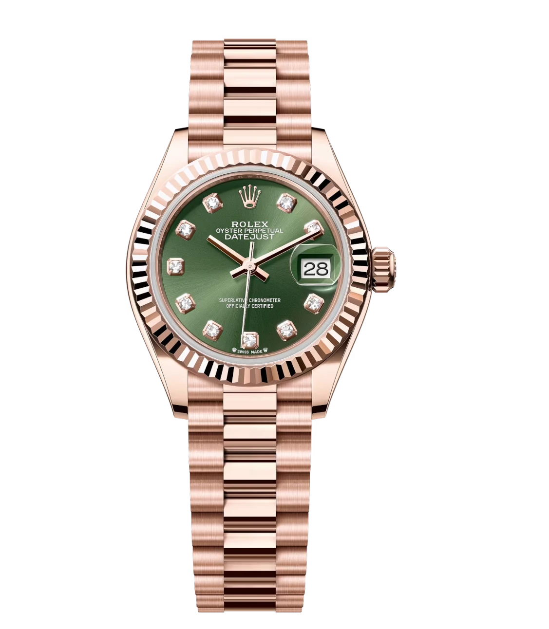 Rolex Lady-Datejust 28 Oyster Perpetual 18 ct Everose gold olive-green, diamond-set dial President band Reference 279175