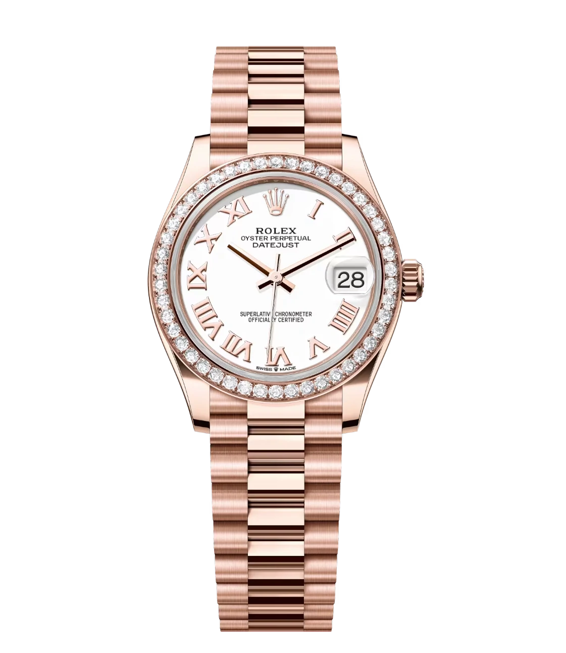 Rolex Lady-Datejust 28 Oyster Perpetual 18 ct Everose gold white dial President band Reference 279135RBR