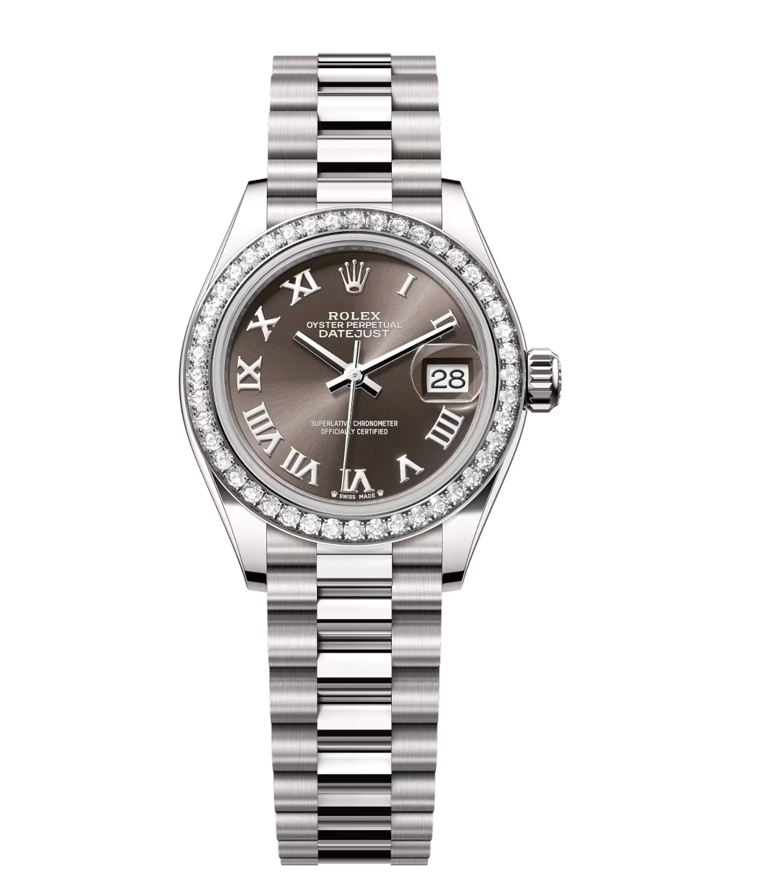 Rolex Lady-Datejust 28 Oyster Perpetual 18 ct white gold dark grey dial President band Reference 279139RBR