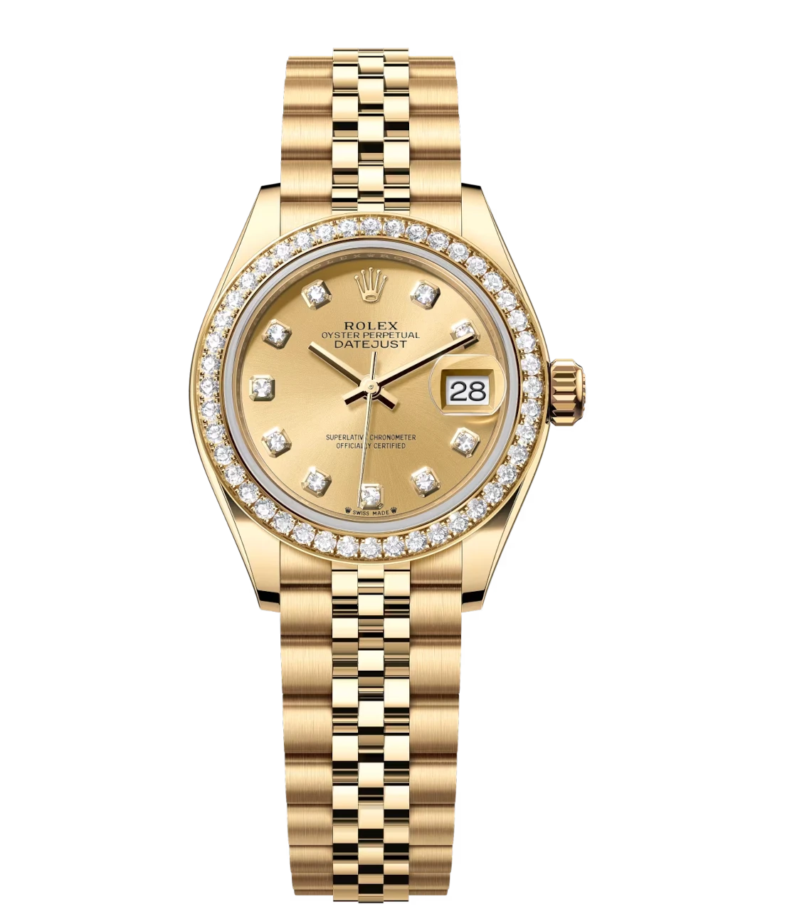 Rolex Lady-Datejust 28 Oyster Perpetual 18 ct yellow gold champagne colour, diamond-set dial Jubilee band Reference 279138RBR