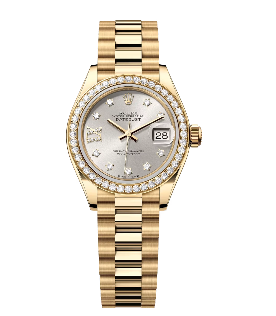 Rolex Lady-Datejust 28 Oyster Perpetual 18 ct yellow gold silver, diamond-set dial President band Reference 279138RBR