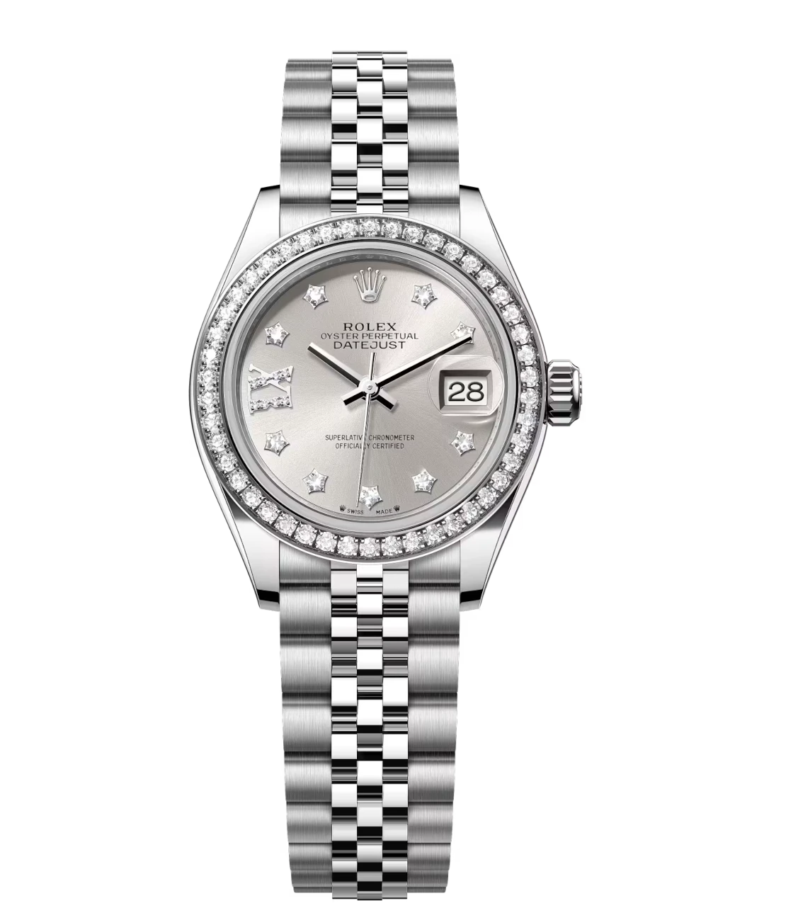 Rolex Lady-Datejust 28 Oyster Perpetual Oystersteel and white gold silver, diamond-set dial Jubilee band Reference 279384RBR